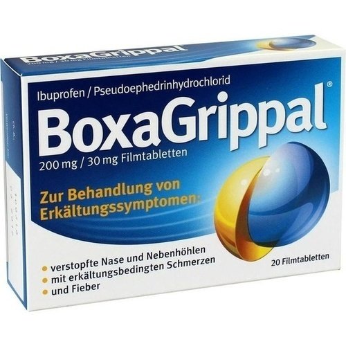 Zur Behandlung von ErkältungssymptomenBoxaGrippal® – bei grippalen Infekten.Bei der akuten viralen Rhinosinusitis – besser bekannt als grippaler Infekt – treten mehrere Erkältungssymptome oft zeitgleich auf. Dies sind in der Regel erkältungsbedingte Schmerzen und durch eine viral bedingte Entzündung der oberen Atemwege, eine verstopfte oder laufende Nase. Als erstes rezeptfreies Erkältungspräparat in Deutschland kombiniert das neue BoxaGrippal® die Wirkstoffe Ibuprofen und Pseudoephedrin-HCI 1.). Dadurch wirkt es bei verstopfter Nase und Nebenhöhlen sowie bei erkältungsbedingten Schmerzen (z. B. Kopf-, Hals- und Gliederschmerzen) und Fieber. Die beschwerlichsten Erkältungssymptome werden somit effektiv gelindert. 2.)3.)4.)Wer darf BoxaGrippal® einnehmen? Erwachsene und Jugendliche ab 15 Jahren.Dosierung1–2 Tabletten alle 6 Stunden (maximale Tagesdosis: 6 Tabletten).Die maximale Anwendungsdauer beträgt 5 Tage.Die wichtigsten Infos zu BoxaGrippal® auf einen Blick: Zur Behandlung von Erkältungssymptomen (verstopfte Nase und Nebenhöhlen, erkältungsbedingten Schmerzen, Fieber). Erste rezeptfreie Kombination in Deutschland mit dem antientzündlichen, fiebersenkenden und schmerzlindernden Wirkstoff Ibuprofen 5.). Enthält den effektiven Nasenschleimhaut-Abschweller Pseudoephedrin-HCl 6.). Schnelle und einfache Einnahme durch Filmtablette gewährleistet. Einnahme: Erwachsene und Jugendliche ab 15 Jahren 1 Tablette alle 6 Stunden; bei stärkeren Beschwerden 2 Tabletten alle 6 Stunden (maximale Tagesdosis: 6 Tabletten). Die maximale Anwendungsdauer beträgt 5 Tage. BoxaGrippal® gibt es als Filmtabletten rezeptfrei in Ihrer Apotheke. Eine Packung enthält 20 Filmtabletten. HCl = Hydrochlorid. Sperber SJ, et al, Evaluation of an alpha agon