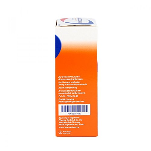 Mucosolvan Kindersaft 30mg/5ml Wirkstoff: Ambroxolhydrochlorid Anwendungsgebiete: Zur schleimlösenden Therapie bei akuten und chronischen Erkrankungen der Bronchien und der Lunge, die mit einer Störung von Schleimbildung und -transport einhergehen.