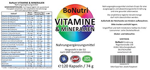 BoNutri VITAMINE & MINERALIEN 23 hochdosierte Vitamine und Mineralien, dazu Q10 und Lutein – das gibt es nur von BoNutri. Diese können Ihren Körper ideal unterstützen. In jeder Kapsel sind: 13 Vitamine: A, B1, B2, B3, B5, B6, B7, B9, B12, C, D3, E, K1. 10 Mineralstoffe: Calcium, Chrom, Eisen, Jod, Kupfer, Magnesium, Mangan, Molybdän, Selen, Zink. Dazu noch Coenzym Q10 & Lutein. Verteilen Sie die Tagesdosis bequem auf leicht zu schluckende 2 Kapseln täglich und decken Sie Ihren Tagesbedarf an einer Vielzahl von lebenswichtigen Vitaminen & Mineralen! 120 Kapseln pro Dose decken den Bedarf von 2 Monaten. Unser hochreinen BoNutri VITAMINE & MINERALIEN unterliegen den gleichen Qualitätskontrollen, die auch in der pharmazeutischen Industrie durchgeführt werden. Dies zeigt das GMP Siegel: Es steht für „Good Manufacturing Practice“, für dauerhafte Qualitätskontrolle. Wir verwenden bewußt Reisstärke anstatt des Trennmittels Magnesiumstearat (Magnesiumsalze), um eine bessere Bioverfügbarkeit zu ermöglichen. Die meisten Anbieter verwenden Magnesiumstearat. Selbst Veganer oder Anwender mit Gluten- oder Laktoseintoleranz können unser Präparat verwenden, wir verarbeiten keine Inhaltsstoffe, die Sie nicht essen möchten oder dürfen. Wenn Sie HEUTE bestellen, können unsere BoNutri VITAMINE & MINERALIEN schon MORGEN bei Ihnen sein! Wir möchten, dass es Ihnen gut geht! Ihr BoNutri-Team