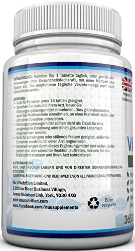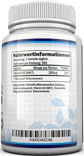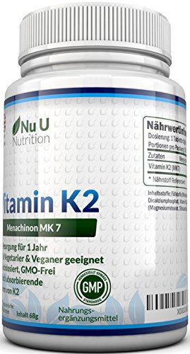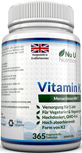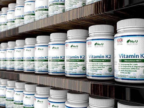Warum sollten Sie SICH für Vitamin K2 MK-7 von Nu U Nutrition entscheiden? *100% GELD-ZURÜCK-GARANTIE – Wir stellen keine Fragen. Fühlen Sie sich besser oder fordern Sie Ihr Geld zurück. *ERWEITERTE REZEPTUR- Unser Vitamin K2 verbindet verschiedene, wichtige Elemente. Wir verwenden den Gold-Standard an Vitamin K2 auch bekannt als MK7, welches leicht bioverfügbar ist und sicherstellt, dass Ihr Körper den maximalen Ertrag aus unserem Vitamin K2 Ergänzungsmittel ziehen kann. Es ist ein teurer Inhaltsstoff, aber unserer Meinung nach, ein Muss für jede Vitamin K2 Rezeptur. Ebenfalls hat unser Produkt die doppelte Stärke als Konkurrenzmarken mit 200mcg an Vitamin K2 pro Tablette. * VERSORGUNG FÜR 12 MONATE – VIERFACHER WERT – Fantastisches Preis-Leistungsverhältnis. Ganz einfach. Keine Neubestellung für ganze 12 Monate nötig. Wir bieten Ihnen die VIERFACHE MENGE als unsere Konkurrenzmarken, welche meist nur 90 Tabletten anbieten. * VEGANES VITAMIN K2 & GMO-FREI – Vegan und Vegetarisches Vitamin K2, welches GMO-frei ist und frei von Milch, Gluten, Laktose, Weizen, Pestiziden, Fungiziden, Kunstdünger und anderen Schadstoffen. *HERGESTELLT IN GROSSBRITANNIEN – Produziert nach höchsten Qualitätsstandards der Welt, in einer hochmodernen Anlage und gemäß GMP-Standards. Wir füllen NICHT nur das Endprodukte in Flaschen in Großbritannien ab, wie einige unserer Konkurrenten, sondern führen den Produktionsprozess zu 100% in Großbritannien durch.