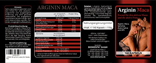 Biomenta – Deutsche QualitätSeit mehr als 30 Jahren Entwicklung und Herstellung von Nahrungsergänzungsmitteln nach strengsten deutschen Qualitätsanforderungen und Standards.L-Arginin plus MACA von Biomenta® ist ein einzigartiger Zusatz für die Nahrungsergänzung. Die legendäre Macawurzel ist bis heute eine Nahrungsquelle der Inkas. Wenn Inkakrieger früher in den Kampf zogen, nutzten sie Maca um eine Leistungssteigerung herbeizuführen und sich in Wallung und Erregung zu versetzen. Zudem ist L-Arginin ein Ausgangsstoff für die Bildung von Stickstoffmonoxid (NO) und hat Auswirkungen auf den Stoffwechsel und die Muskulatur.Entscheidend ist für uns, dass man dem Körper gleichzeitig weitere Stoffe zuführt, damit alles optimal umgesetzt werden kann. Daher ist unsere Pulver Kapsel L-Arginin plus MACA angereichert mit hochwertigem Maca-Extrakt, L-Arginin Hydrochlorid, Alge Spirulina, Avena Sativa, OPC-Traubenkernextrakt, Zink und vielen weiteren Vitaminen und essentiellen Aminosäuren.Ihre Vorteile:+ Hochdosierte Kapseln ohne Zusätze basierend auf natürlichen und pflanzlichen Wirkstoffen+ Rohstoffe aus und Herstellung in Deutschland+ Ausschließliche Verwendung von hochwertigen Rohstoffen+ Produktsicherheit gemäß dem HACCP-KonzeptTagesverzehrempfehlung: 4 KapselnMengen (pro Tagesverzehr):- 1.500 mg L-Arginin- 3.500 mg Maca Extrakt- 10 mg Zink Biomenta® Bewusster Leben