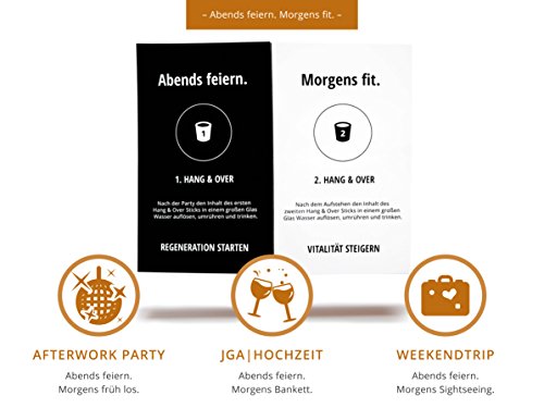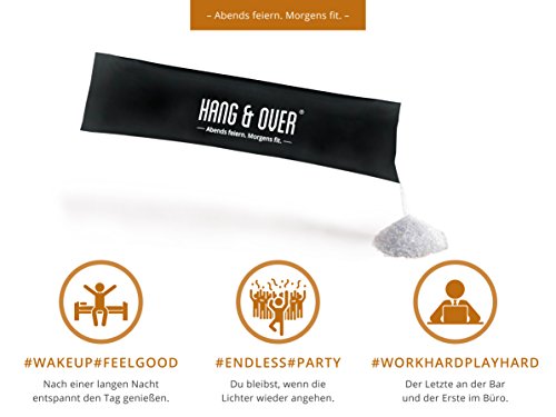 Hang & Over – Abends feiern. Morgens fitter. Dein revitalisierendes Nahrungsergänzungsmittel nach dem Feiern! Hang & Over Sticks auflösen und fitter in den Tag starten. WELCHER PARTY-TYP BIST DU? #wakeup #feelgood Nach einer langen Nacht entspannt den Tag genießen. #workhardplayhard Der Letzte an der Bar und der Erste im Büro. #endless #party Du bleibst, wenn die Lichter wieder angehen. DAS IST DRIN 1. Klarer Kopf: Mit Vitamin B12 gegen Müdigkeit. 2. Wohlbefinden: Für den Feelgood Effekt am nächsten Morgen 3. Vitalität: Magnesium unterstützt das Elektrolytgleichgewicht. Kalium unterstützt die normale Funktion von Muskeln und Nerven 4. Unterstützung: Cholin trägt zu einer normalen Leberfunktion bei QUALITÄT UND SICHERHEIT: Made in Germany Unser Produkt ist in Deutschland entwickelt und von zertifizierten deutschen Laboren geprüft. Schnell und einfach bestellen. Hang & Over ist ein Nahrungsergänzungsmittel für den Feel-Good-Effekt nach dem Feiern. Ein perfektes Alkohol-Geschenk! | JETZT TESTEN & BESTELLEN 10 Sticks reichen für 5 Partynächte.